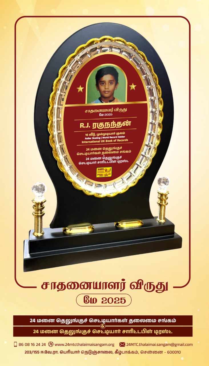 மே 2025 சாதனையாளர் விருது செல்வன் R. J. ரகுநந்தன் ரோலர் ஸ்கேட்டிங் விளையாட்டில் உலக சாதனை இண்டர்நேஷனல் புக் ஆப் ரெக்கார்ட்ஸ் 2025அவர்களுக்கு வழங்கி கௌரவிப்பதில் நாம் பெருமை கொள்கிறோம்